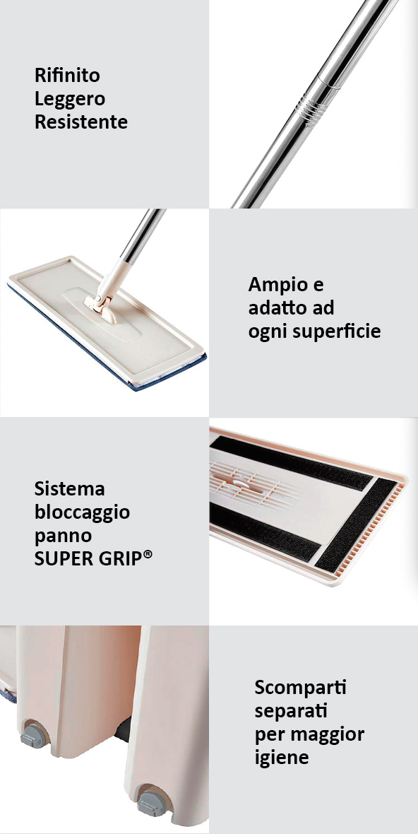 UN SISTEMA DI STRIZZATURA INFALLIBILE CHE RIMUOVE TUTTI I RESIDUI DAL PANNO SENZA NECESSITA' DI FARLO MANUALMENTE.